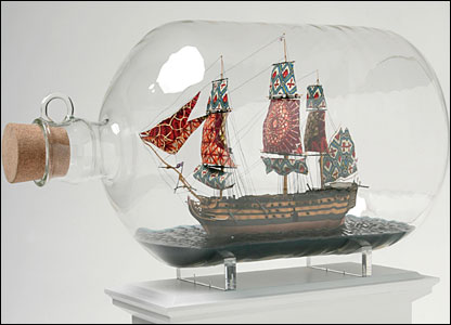 Descriere: Este un tip de ornament deosebit, care consta intr-o sticla in interiorul caruia a fost asamblat un vapor/barca. Modul de realizarea presupune multa rabdare si atentie la detalii, insa exista si metode mai simple de realizare. Pe piata internationala exista kituri care contin toate piesele si instructiunile necesare pentru realizarea unui astfel de obiect.